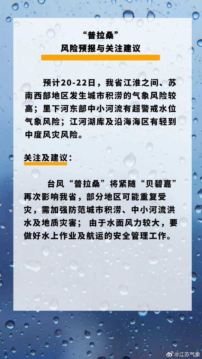 中秋节的暴雨刚刚结束新一轮台风天气又要来了刚刚江苏气象发布重要天气报告第14号台风“普拉桑”19日至22日将影响我省具体天气情况跟着晨小编一起来看看台风“普拉桑”来了预计,“普拉桑”将以每小时35-4