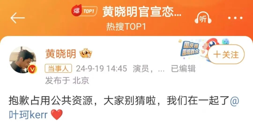刚刚#黄晓明官宣恋情#话题登上热搜第一黄晓明发文正式宣布自己恋情:抱歉占用公共资源,大家别猜啦,我们在一起了!黄晓明发文半小时前,叶珂也在个人社交账号发布一张黄晓明和团队的聊天记录截图,称“有点莫名其