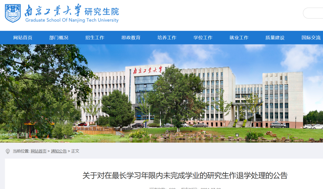 近日,南京工业大学研究生院网站发布《关于对在最长学习年限内未完成学业的研究生作退学处理的公告》,对35名研究生作退学处理。全文如下:关于对在最长学习年限内未完成学业的研究生作退学处理的公告