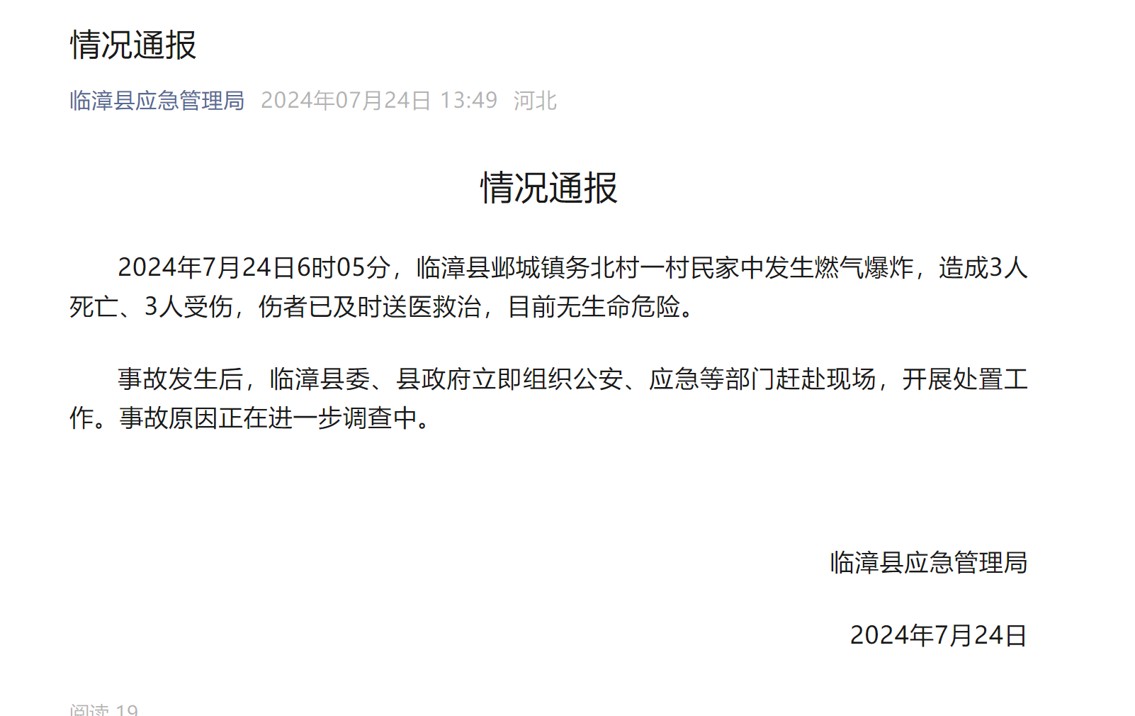 7月24日,有网民发消息称,河北省邯郸市临漳县邺城镇务本村一处民房发生爆炸。7月24日中午,河北邯郸市临漳县应急管理局发布情况通报,事故造成3人死亡、3人受伤。通报全文如下:7月24日6时05分,临漳