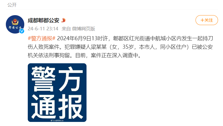 据@成都郫都公安 消息,2024年6月9日13时许,郫都区红光街道中航城小区内发生一起持刀伤人致死案件。犯罪嫌疑人梁某某(女,35岁,本市人,同小区住户)已被公安机关依法刑事拘留。目前,案件正在深入调