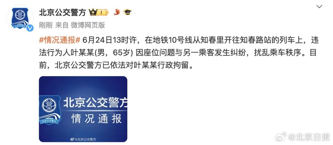 6月24日,一段“北京地铁上女子疑因不愿让座遭老人袭扰”的视频,引发网友关注。刚刚,北京警方发布情况通报,该男子已被行拘。具体情况一起来看看!通报内容据@北京公交警方 ,6月24日13时许,在地铁10