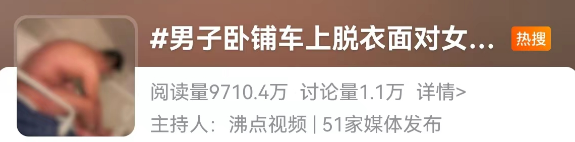 “我用余光看到他全脱掉了觉得很匪夷所思他没盖被子就是朝着我这边全裸的”6月15日一则新闻冲上热搜网友炸锅了↓↓↓6月14日乘客郭女士爆料她在乘坐T35次列车时一名男子深夜在铺位上脱光衣服面对着她裸睡这