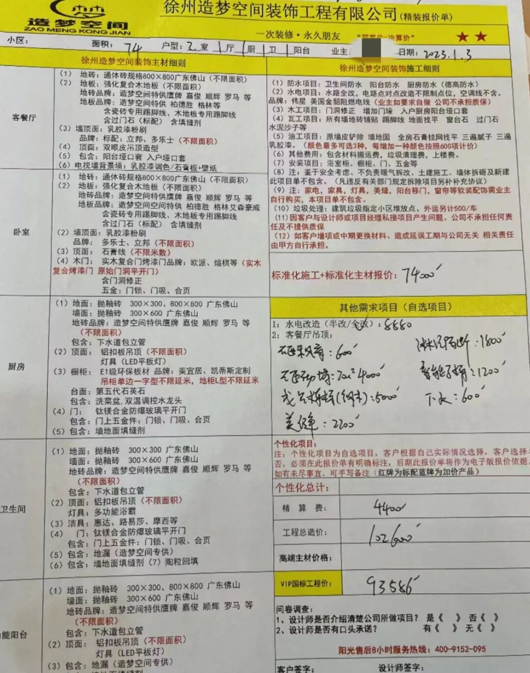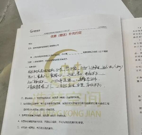 近日,市民郭女士向徐报“家装帮办”栏目反映,去年1月,她与徐州造梦空间装饰工程有限公司(以下简称:造梦空间)签订了精装合同,工期不仅没按约定时间完成,合同内约定的“优惠(赠送)内容”也始终没有兑现。交