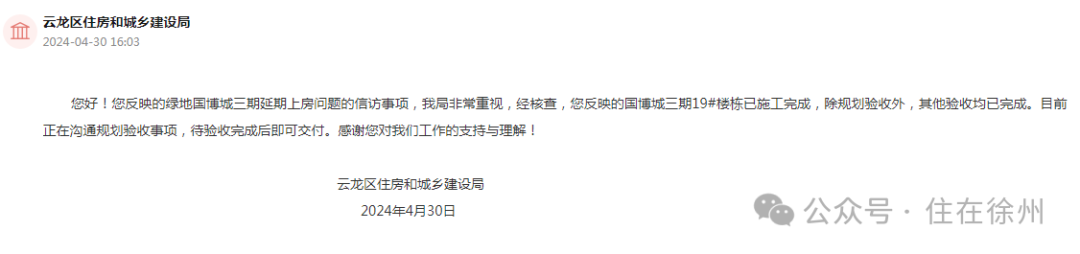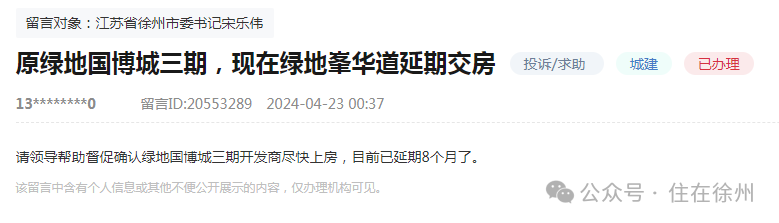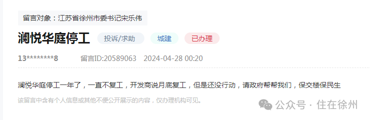 徐州这些停工延期半年、甚至一年多的小区啥时候复工?最新官方回复来了!业主:澜悦华庭停工一年官方回复:积极推进复工款的落实业主:澜悦华庭停工一年了,一直不复工,开发商说月底复工,但是还没行动,请政府帮帮